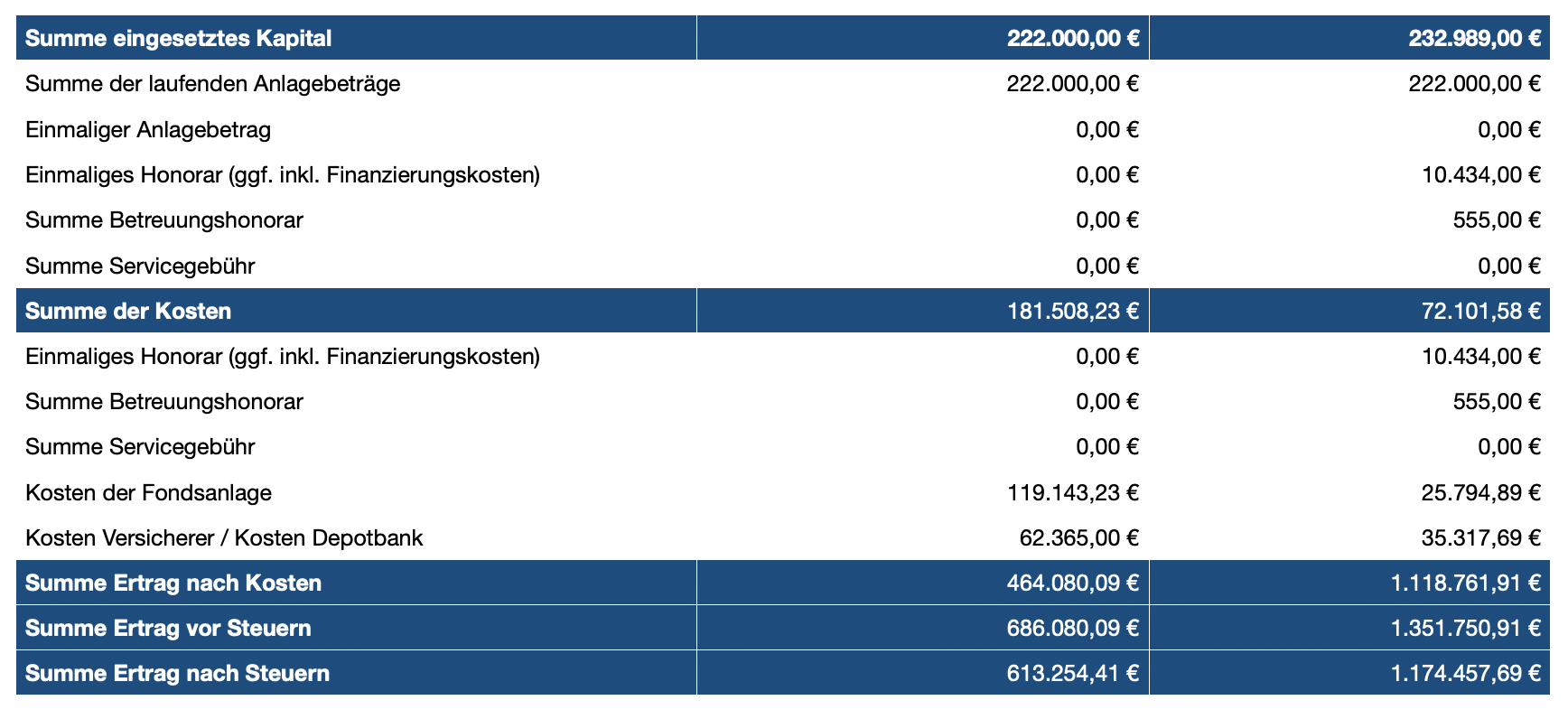 …einer Tarifoptimierung. Hier spart der Kunde auf der rechten Seite ca. 110.000 € Kosten und hat so später über 561.000 € mehr nach Steuern in seinem Vertrag und somit mehr für seine Rente!